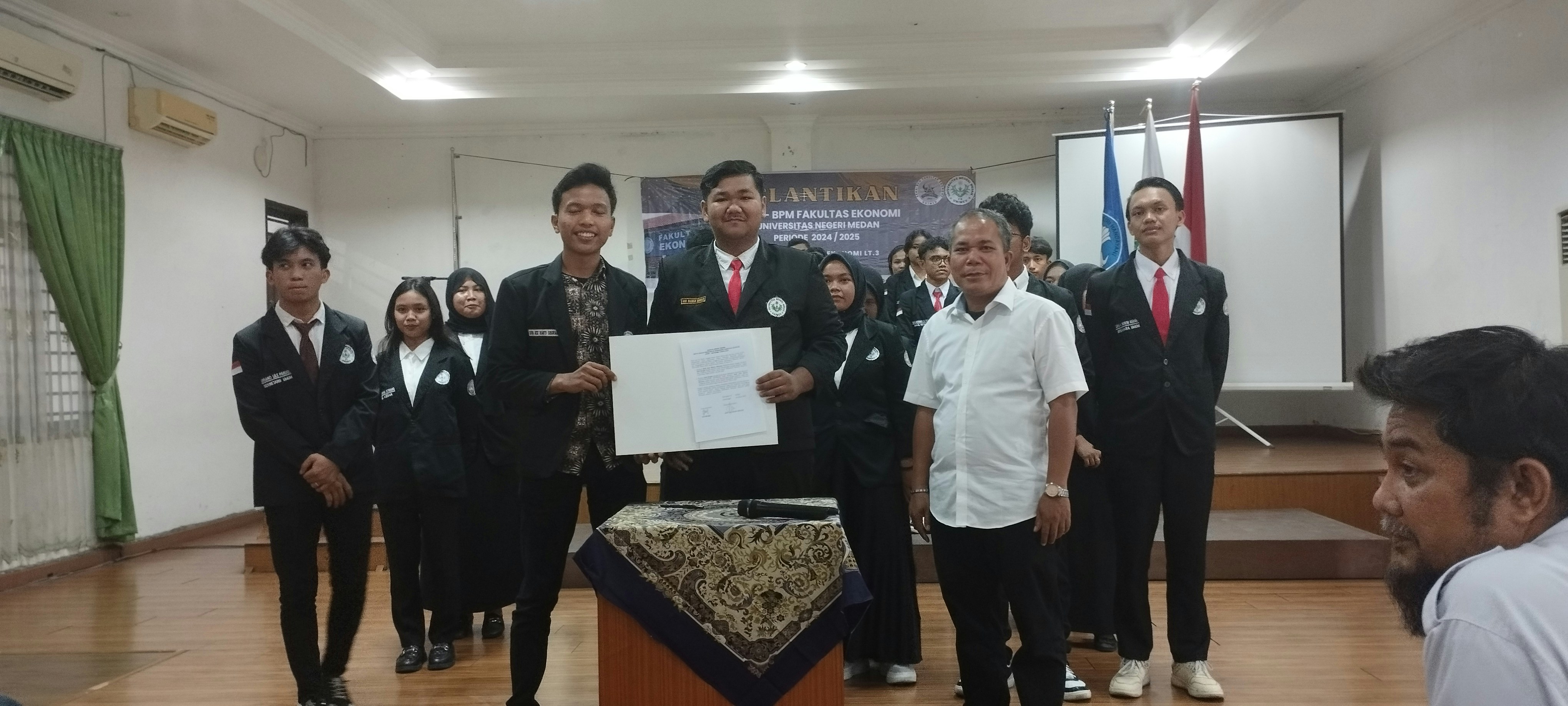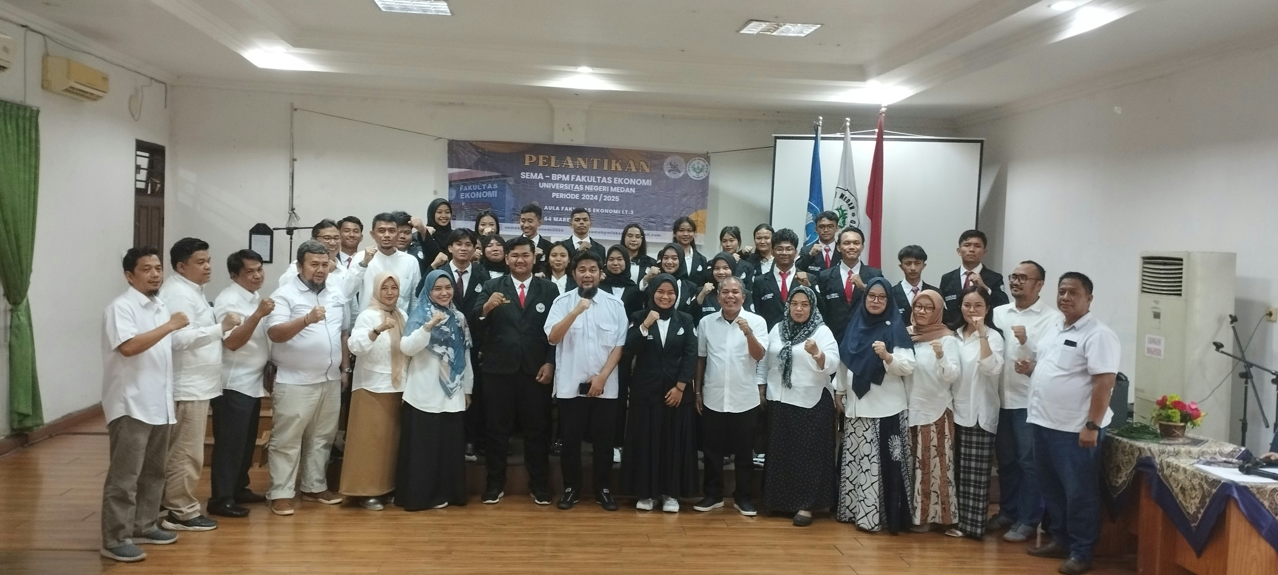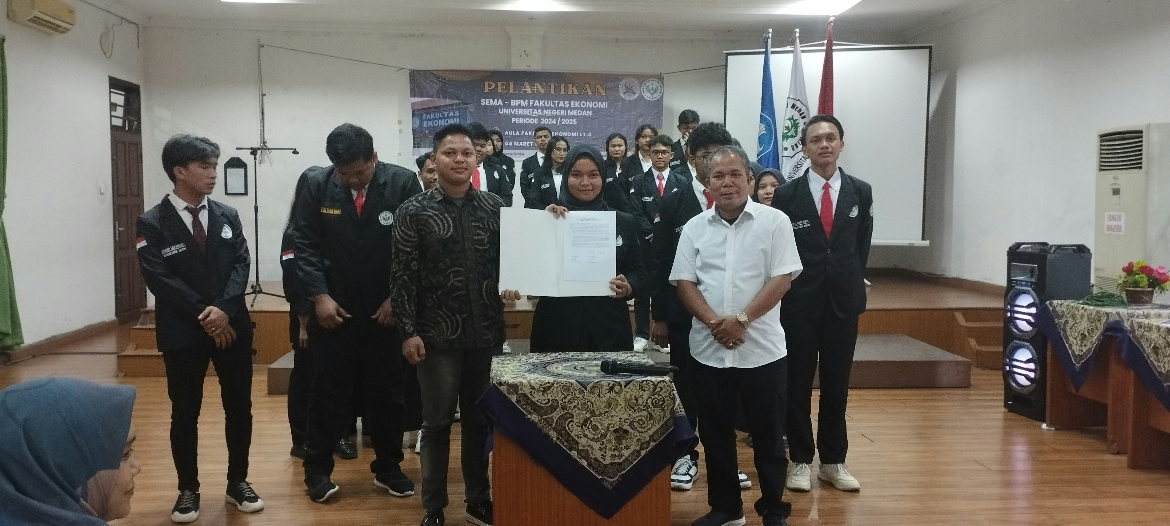 Dekan Fakultas Ekonomi Universitas Negeri Medan (FE UNIMED), melantik pengurus baru Senat Mahasiswa (SEMA) dan Badan Perwakilan Mahasiswa (BPM) FE UNIMED Periode 2024-2025 (Senin 04 Maret 2023).