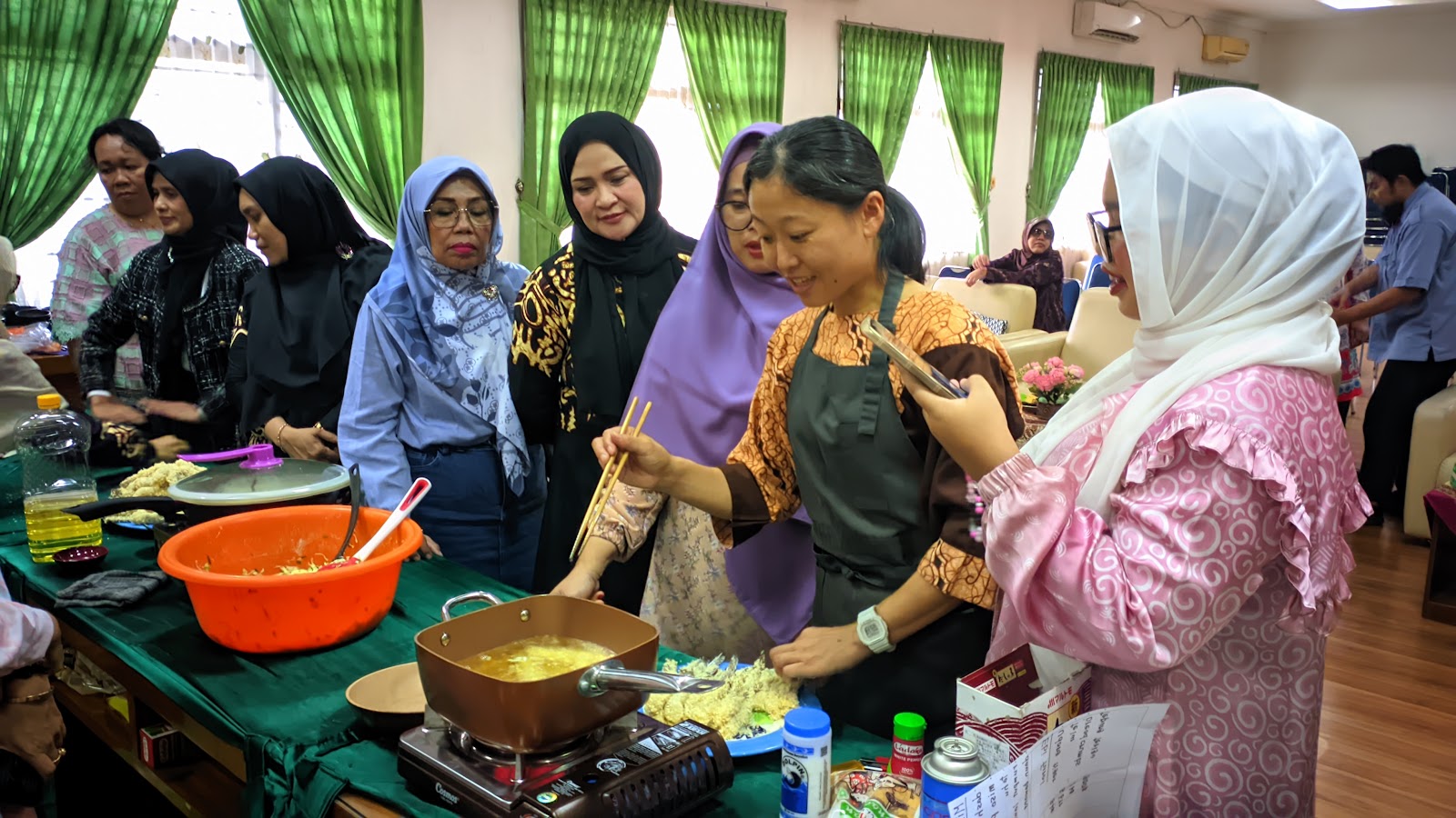 Para peserta, yang terdiri dari pengurus dan anggota DWP Sub Unit FE UNIMED, terlihat antusias mengikuti setiap langkah pembuatan hidangan. Mereka aktif bertanya dan mencatat tips-tips penting yang diberikan oleh Chef Erie. Acara ini berlangsung lancar dan interaktif. Di akhir sesi, peserta berkesempatan mencicipi hasil masakan dan berfoto bersama Chef Eri Sakakibara.