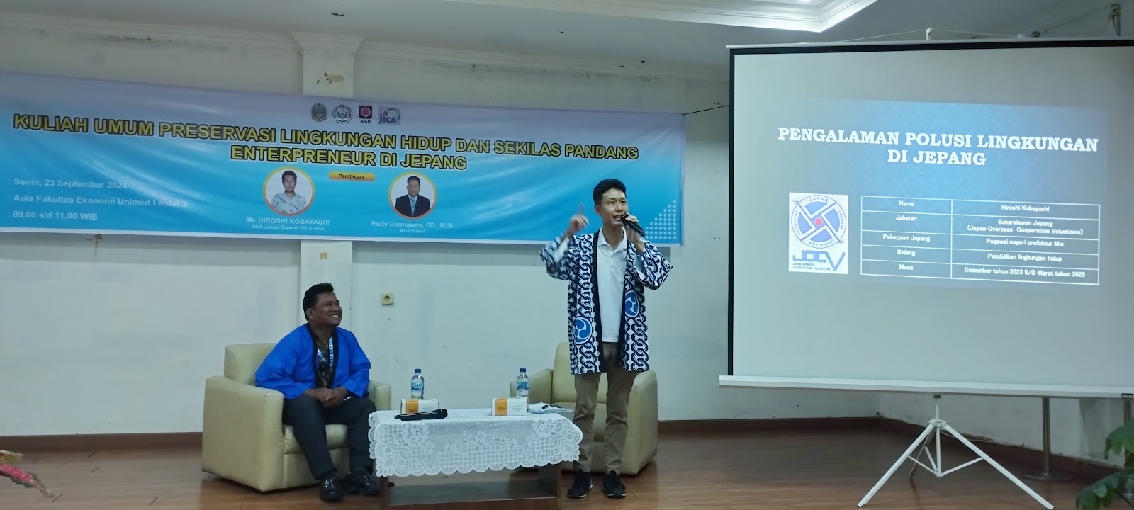 Fakultas Ekonomi Universitas Negeri Medan (FE UNIMED) mengadakan kuliah umum bertema "Edukasi Lingkungan dan Enterpreneurship Jepang" pada Senin, 23 September 2024. Acara yang berlangsung di Fakultas Ekonomi UNIMED ini menghadirkan dua pembicara, yaitu Mr. Hiroshi Kobayashi dari JICA Environment Junior Expert dan Rudy Dermawan, SS., M.Si. dari ASJI Sumut.