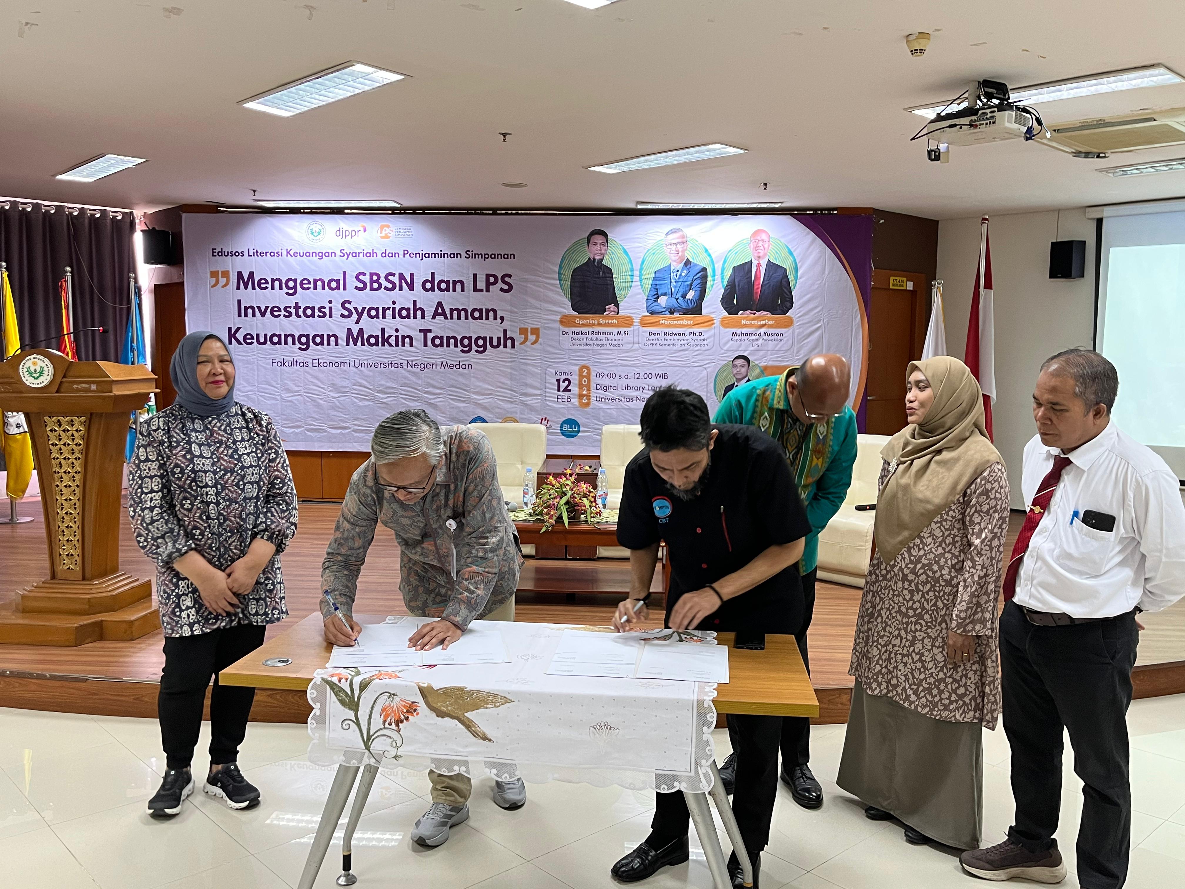 Sebagai tindak lanjut konkret dari pertemuan ini, kedua belah pihak menandatangani dokumen Implementasi Kerja Sama (IA) yang disaksikan oleh jajaran pimpinan fakultas. Kesepakatan ini tidak hanya terbatas pada penyelenggaraan seminar semata, tetapi juga membuka peluang kolaborasi lanjutan yang lebih substansial di bidang penelitian dan pengabdian kepada masyarakat di masa mendatang. Sinergi antara FE UNIMED dengan regulator keuangan negara ini diharapkan mampu menciptakan ekosistem akademik yang lebih responsif terhadap dinamika ekonomi global, sekaligus mencetak lulusan yang memiliki kompetensi mumpuni dalam literasi keuangan syariah dan manajemen risiko, sehingga siap berkontribusi dalam pembangunan ekonomi nasional yang inklusif dan berkelanjutan.
